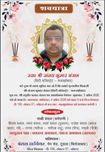 नोट :-प्राप्त जानकारी के अनुसार श्री संजय कुमार पूर्व से ही उच्च रक्तचाप एवं श्वसन सम्बन्धी समस्या से पीड़ित थे। स्वास्थ्य बिगड़ने पर फोर्टिस हास्पिटल, नोएडा में उपचार हेतु भर्ती हुये थे, जहां पर चिकित्सकों द्वारा अवगत कराया गया कि मल्टी आर्गन फल्योर होने की वजह सेदिनांक 3/4/2026 क़ो सांय लगभग 04.00 बजे उनका निधन हो गया।